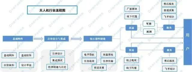 无人机行业产业链大致可分为研发、生产、销售、服务等细分领域,具体可分为产品研发试验、飞控系统开发、发动机等关键零部件生产、载荷制造、无人机整机组装、无人机销售、无人机作业培训、运营服务业务、一体化应用服务环节。