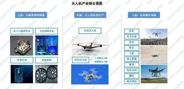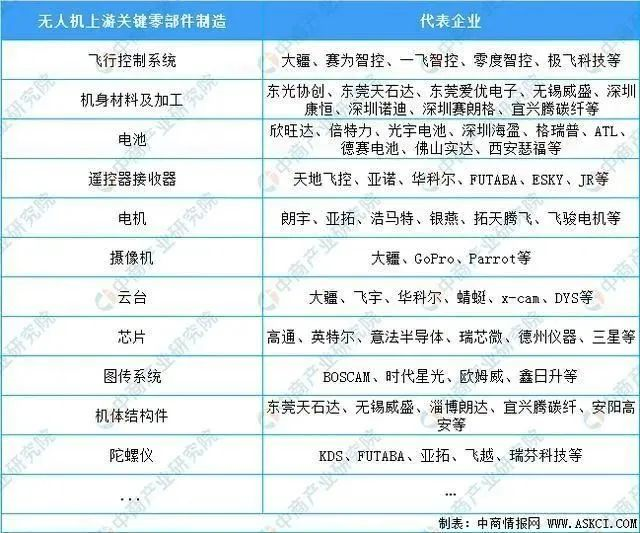 资料来源:中商产业研究院整理 无人机作为智能机器人的一种,产业链条、技术链条都很长。上游为无人机研发、飞控系统、机载设备以及发动机等关键零部件制造,中游为无人机组装生产,下游为应用技术服务。在整条产业链中,上下游产业附加值较高,仅能够进行组装而无力生产关键零部件的厂家将会逐渐遭到淘汰,只有掌握包括飞控系统、无人机航空发动机在内的核心零部件研发制造,或者提供客户所需应用服务的企业才能在未来的无人机行业中立于不败之地。