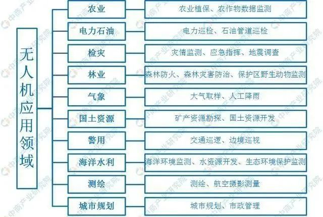 此外,随着无人机产业链配套逐渐成熟、硬件成本曲线不断下降和市场价格的降低,无人机市场关注度持续攀升,消费级无人机的客户群体从小众拓展至大众,客户规模呈现指数级增长。消费类无人机、商用无人机和政府无人机是拉动无人机行业增长的三大类。预计2021年,消费无人机出货量将达到2900万架,复合年均增长率为31.3%。同时,企业无人机出货量将达到805000架,五年复合年均增长率为51%。 无人机产业链下游应用分析 工业级无人机在行业应用的深度和广泛是技术与经验长期积累的结果,在各行业不同细分领域具有极大的商业价值。根据不同的需求,无人机诞生了不同的功能,在给许多行业带来极大便利的同时,由于无人机应用领域的不断延伸,也催生了许多细分的无人机产业。 目前,工业无人机在农业、电力、通信、气象、农林、海洋、勘探、影视、执法、救援、快递等专业领域的应用,都显示了极好的技术效果和经济效果。